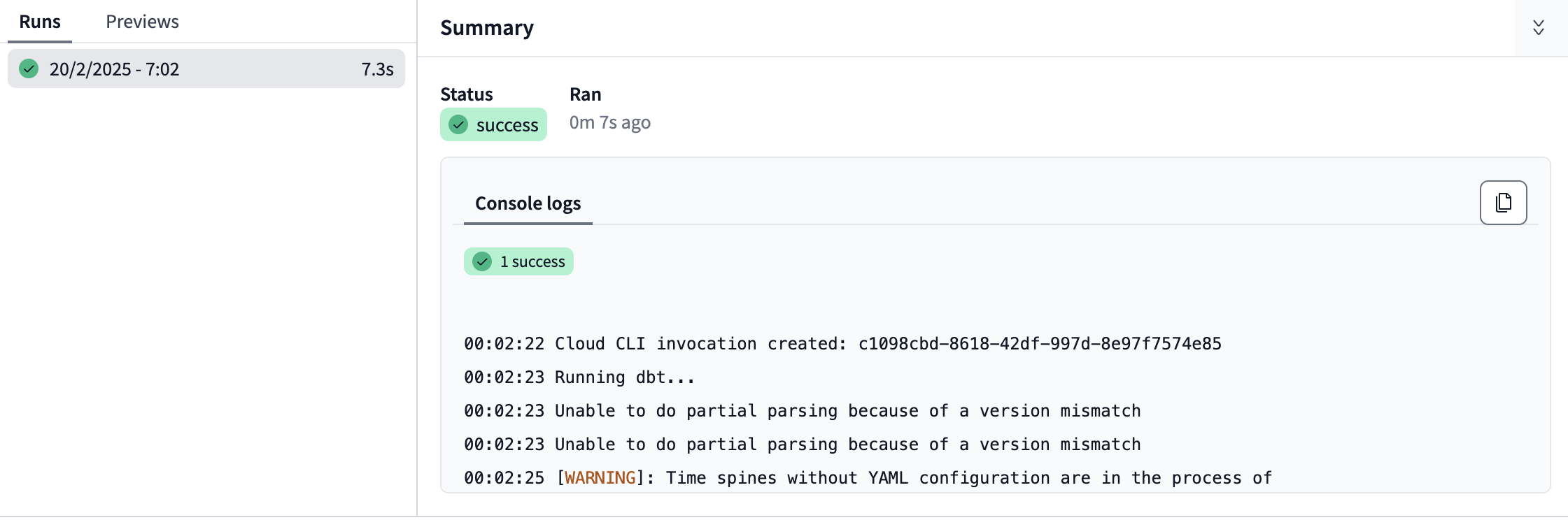 The results of a successful run in the 'Runs and previews' pane.The results of a successful run in the 'Runs and previews' pane.
